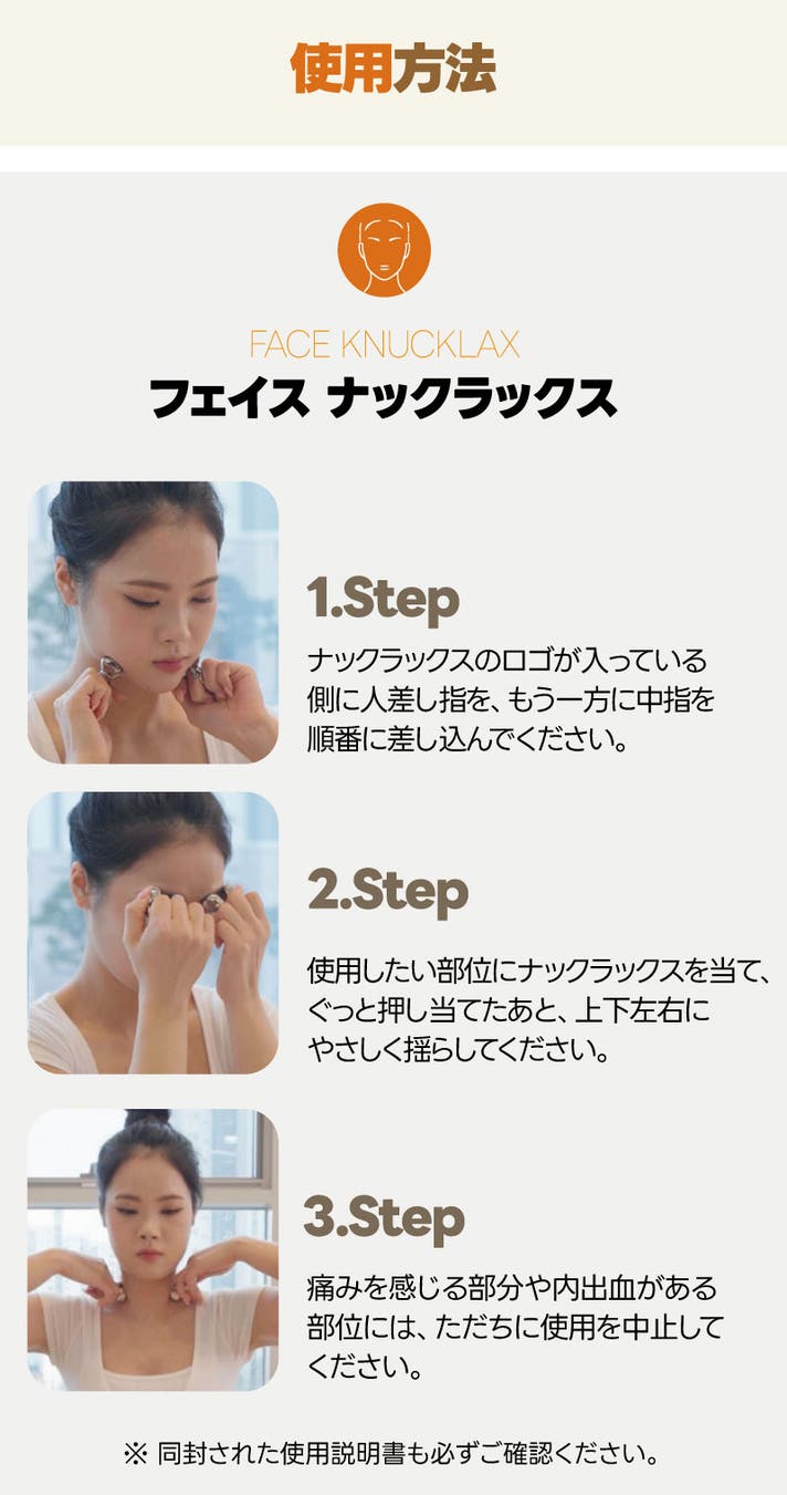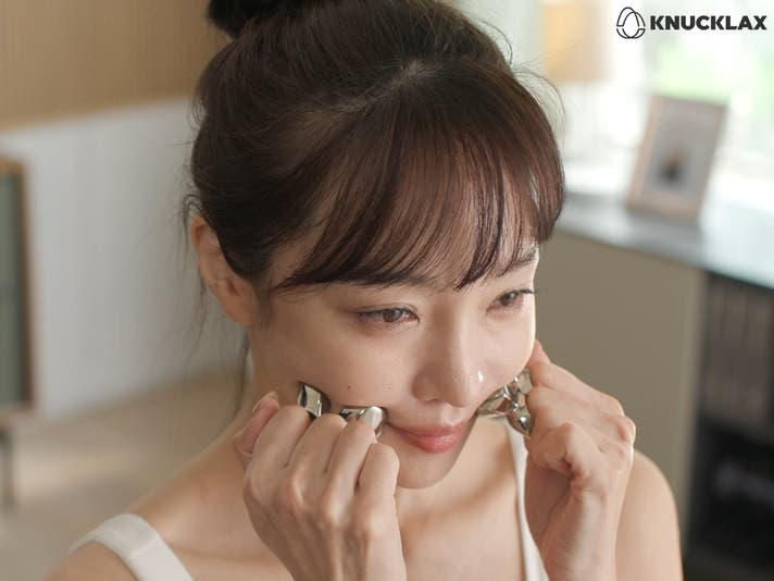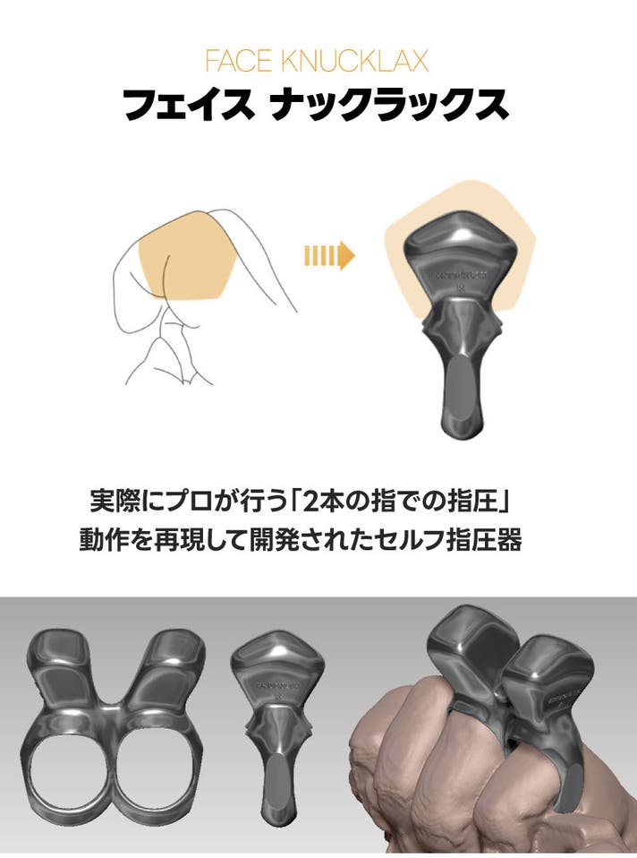 FACE KNUCKLAX(フェイス ナックラックス)は、人差し指と中指でポイントをぐっと押す――そのときの角度、指の開き方、圧の伝わり方に徹底的にこだわり、3Dデータで精密に再現。顔まわりの気になる部分にぴったりフィットし、自分の手では届きにくいポイントにも自然にアプローチできます。