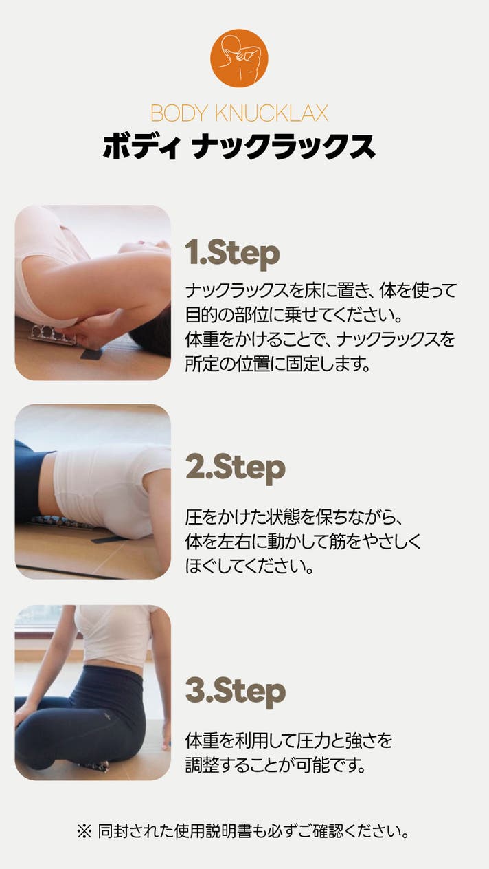 BODY KNUCKLAX(ボディ ナックラックス)は、床に置いて自分の体重をかけて指圧することが、他の指圧アイテムとの大きな違いです。