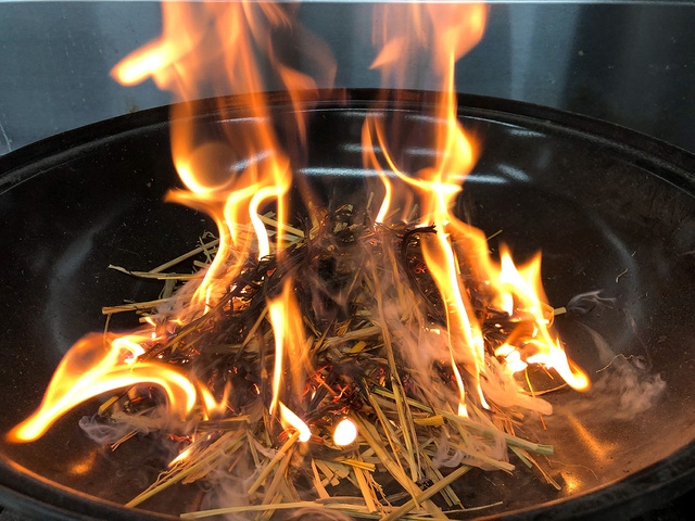 大量の藁を燃やした高温の炎でさっと炙り、身の表面だけを焼き上げます。同時に藁から出る煙で燻されるので、香ばしさを身にまとわせていきます。