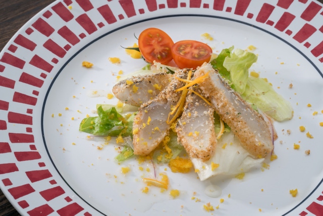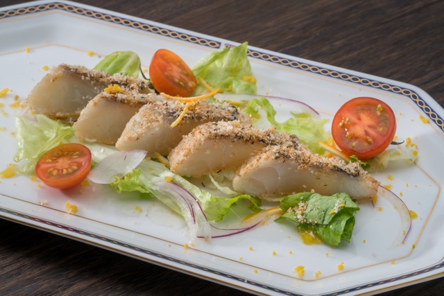 パン粉とバジルやパセリなどの香草と柑橘果皮の摺り下ろしを混ぜたものを真鯛の身にまぶして、表面だけをこんがりと焼き上げています。こちらは洋風のアレンジでいかがでしょうか?