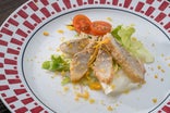 ・レタスやベビーリーフなどの野菜と盛り合わせ、ドレッシングをまとわせて