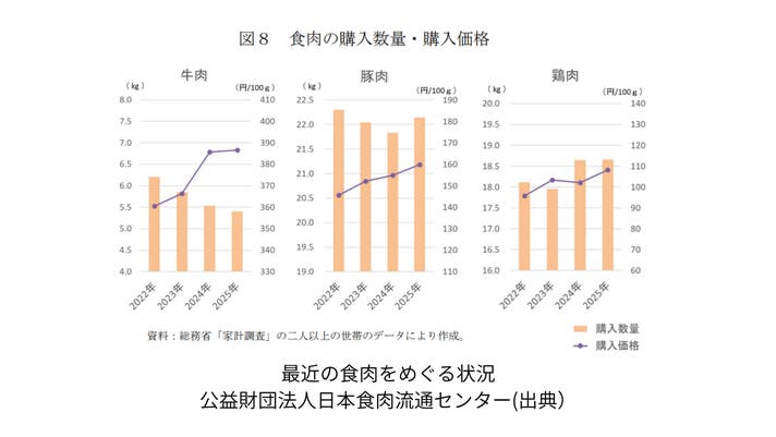 具体的に牛肉の金額が上がっているのに対しての家庭内での牛肉の消費量の減少が顕著である事が数値で見てわかります。