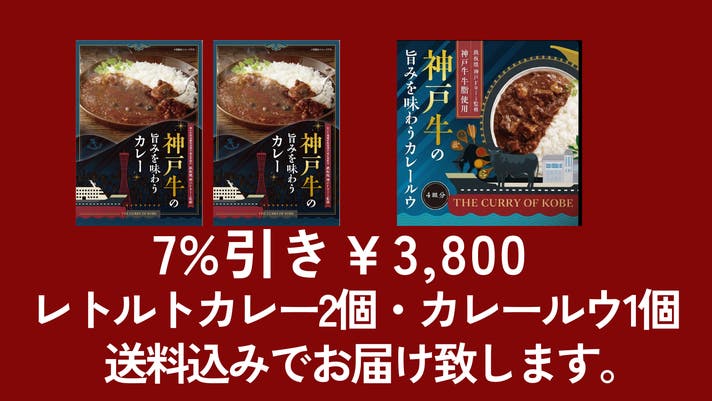 神戸牛の旨みを味わうカレー(レトルト)2個×神戸牛の旨みを味わうカレールウ1個セット送料込みで通常価格¥4,080→¥3800(7%引き)にて販売。