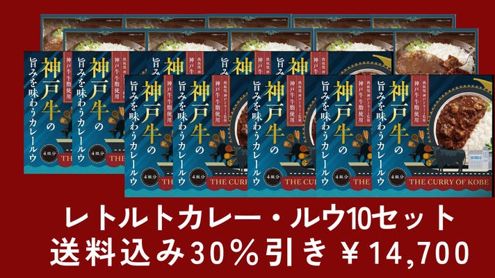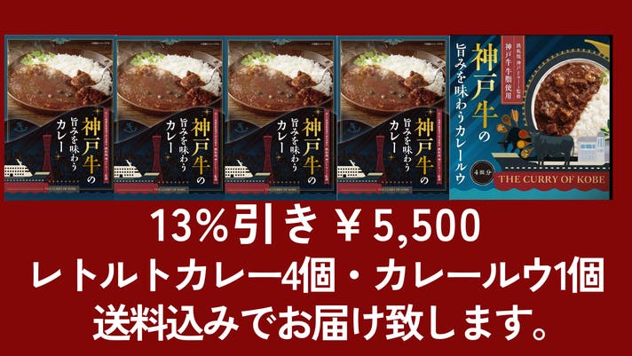 神戸牛の旨みを味わうカレー(レトルト)4個×神戸牛の旨みを味わうカレールウ1個セット送料込みで通常価格¥6,322→¥5,500(13%引き)にて販売。
