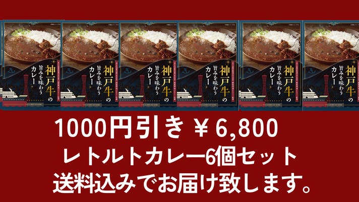 神戸牛の旨みを味わうカレー(レトルト)6個セット送料込みで通常価格¥7,800→¥6,800(1000円引き)にて販売。