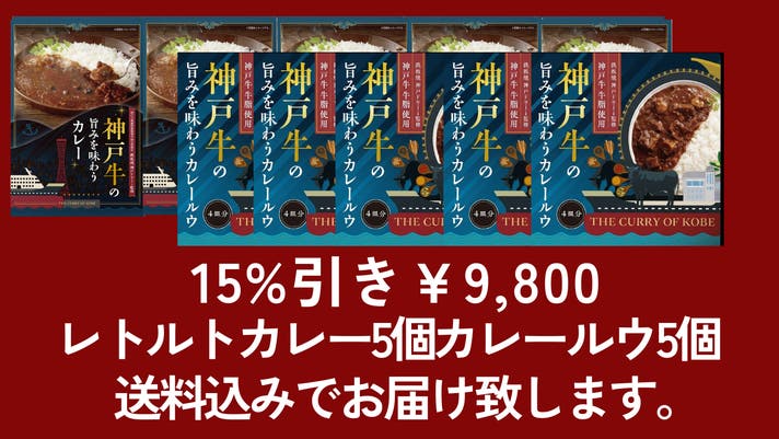 神戸牛の旨みを味わうカレー(レトルト)5個×神戸牛の旨みを味わうカレールウ5個セット送料込みで通常価格¥11,529→¥9,800(15%引き)にて販売。