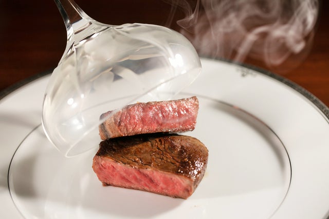他にも「兵庫県産三田牛のステーキ、バーボンの香りを纏わせて」は、