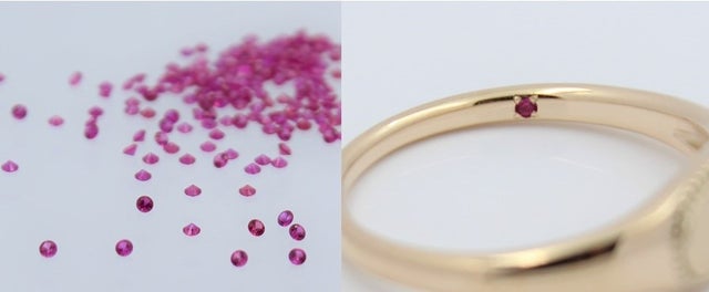 リングの内側には天然ルビーを1ピース配しました。ルビーはその燃えるような赤色から、情熱と愛情の象徴として大切にされてきました。また、災難から持ち主の身を守り、困難に打ち克ち勝利へ導くパワーがあると言われてきました。そんなルビーを内側に配することで、あなたの肌に常に触れているように願いを込めてセッティングしております。