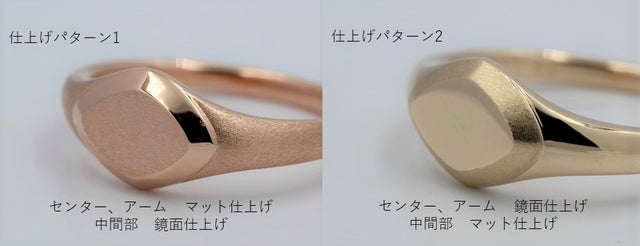 トップ部分とその周囲のコントラストがポイントのボリューム感のあるシグネットリング。マット仕上げと鏡面仕上げのパターンは2パターンからお好きな方をお選びいただく事が出来ます。K10とK18はピンクゴード、イエローゴールド、ホワイトゴールドからお選びいただけます。サイズは7号~20号まで、あなたの指サイズに合わせてお創り致します。