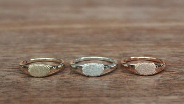 トップ部分はジュエリー職人の手仕事によるマット仕上げ。その周囲に通常ミル打ちと呼ばれる加工を施したベーシックなシグネットリング。K10とK18はピンクゴード、イエローゴールド、ホワイトゴールドからお選びいただけます。サイズは7号~20号まで、あなたの指サイズに合わせてお創り致します。