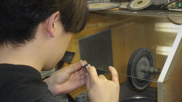2人目の職人は、ジュエリーの組み立てや仕上げの工程を行う職人です。弊社のジュエリー原型は複数のパーツに分かれて製作される事が多くあります。なぜかというと、複数のパーツに分けることで、通常であれば工具が入らない細部まで手を加えることが出来るからです。彼はジュエリーの工具以外に身の回りにあるような様々な素材を使用して別次元の仕上げを実現させます。一方で、複数に分けることでロウ付けと言われる組み立ての工程が加えられます。ロウ付けは高温の火を使用しますが、このロウ付けの出来もジュエリーの完成度に大きく影響します。仕上げ磨きの技術、酸化させないロウ付けの特殊な技術によって完成度の高いジュエリーが仕立てられます。