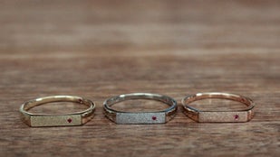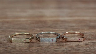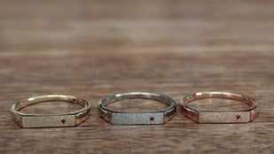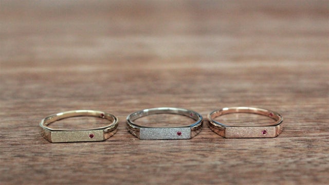 シンプルで華奢な印象のシグネットリング。トップに天然ルビーを1石配しました。トップ部分をジュエリー職人の手仕事によるマット仕上げにすることで上品な雰囲気に仕上がっています。重ね付けでボリューム感を出しても可愛いです。K10とK18はピンクゴールド、イエローゴールド、ホワイトゴールドからお選びいただけます。サイズは7号~20号まで、あなたの指サイズに合わせてお創り致します。