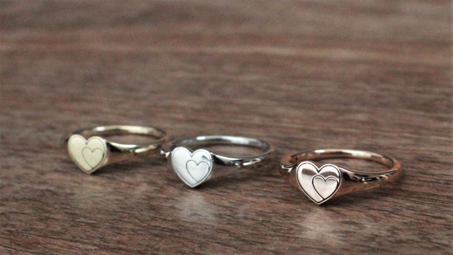 トップ部分に重なった2つのハートがデザインされた可愛いシグネットリング。トップ部分の仕上げはキラッと輝く鏡面仕上げと落ち着いて上品な雰囲気のマット仕上げの2パターンからお好きな方をお選びいただく事が出来ます。K10とK18はピンクゴード、イエローゴールド、ホワイトゴールドからお選びいただけます。サイズは7号~20号まで、あなたの指サイズに合わせてお創り致します。