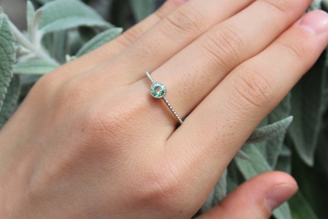 リング着用イメージです。晴れた太陽光の下ですと、淡いグリーン色に。