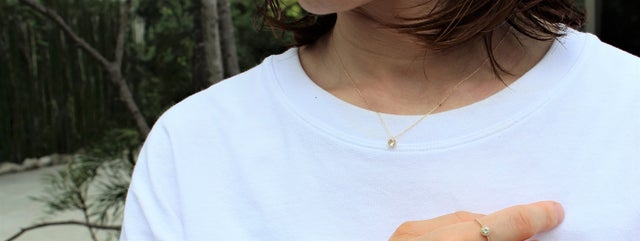 ペンダント着用イメージです。シンプルで合わせやすいデザインです。太陽光の下ですと、淡いグリーン色に見えます。