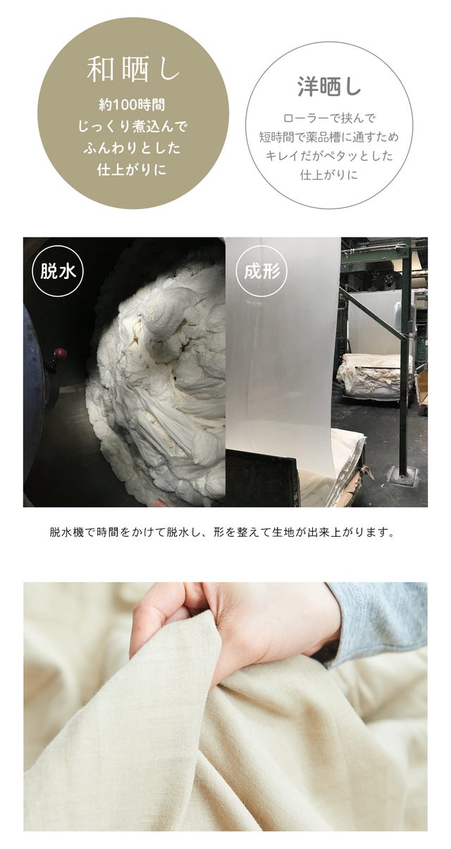 生地を煮込む?と不思議に思う方もいらっしゃるかもしれません。煮込みの工程は「晒し」といい、生地から不純物を取り除き漂白する工程。和晒しの場合は、約100時間かけてじっくりと煮込むため、生地にストレスがかからず繊維の形状が崩れにくいため、やわらかく吸水性のよい仕上がりになります。国内で加工できる工場が限られた、貴重な製法です。