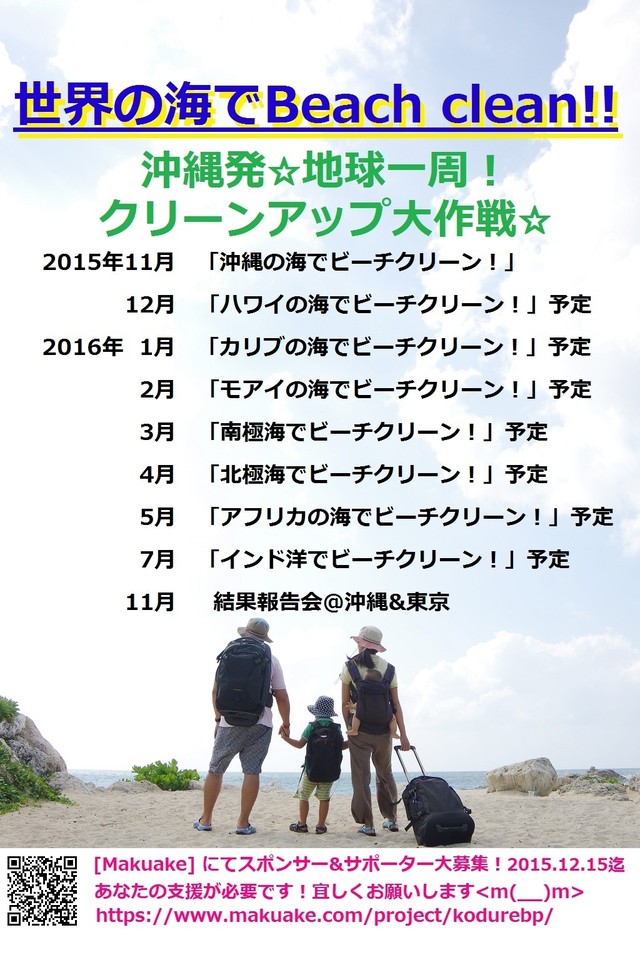「Makuake(マクアケ)」は、実行者の想いを応援購入によって実現するアタラシイものやサービスのプラットフォームです。このページは、 社会貢献カテゴリの 「『世界の海でビーチクリーン!』沖縄発、親子で地球一周クリーンアップ大作戦☆」プロジェクト詳細ページです。