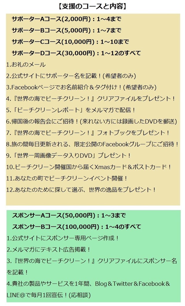 ただこの大作戦には予算が必要で、私たち家族だけでは賄い切れない現状です。是非ご支援いただき、世界一周と『世界の海でビーチクリーン!』の一度で2度オイシイ疑似体験をしませんか?クラウドファンディングが目標額に届き、プロジェクトが無事遂行される際には、約9ヶ月を予定している旅の様子をご覧いただき、約1年後になる成果物のお届けを楽しみにお待ちしていただくという、とてもお得なご支援になります(^^)