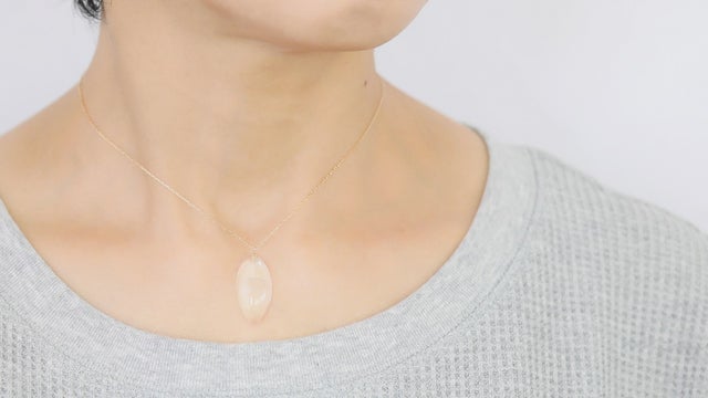 背部に丸いくぼみをつけることで、表からは楕円の模様で猫の目のように見える天然水晶を使用したペンダント。透明感がありさりげなく纏えます。