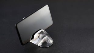 人工水晶で作られたスマートフォンスタンド。裏に日本の伝統的な麻の葉文様を入れ、ご要望により名前や日付、好きな言葉を30文字以内で刻印させていただきます。