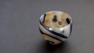 模様がついた天然石のどこを使用するとどんな見え方になるか。最終的な見え方を考え、加工するポイントを探す”石取り”という作業では、数日悩むこともあります。だからこそ生まれる美しさ。滑らかで持ち心地も良いこの世に2つとない模様のぐい呑みです。