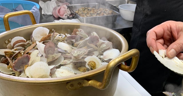 大鍋で一気に蒸し上げ、うまみを逃さず貝柱とヒモだけを使います。