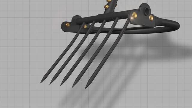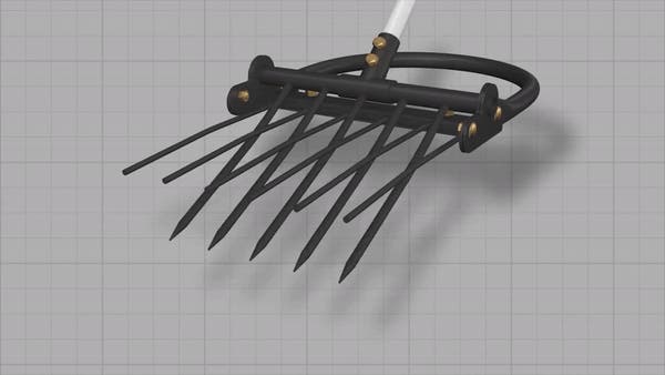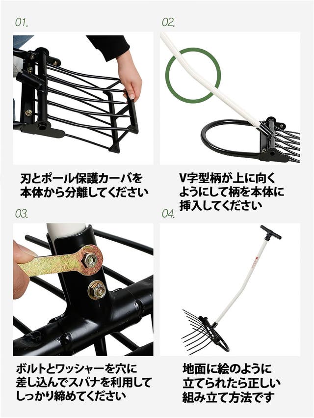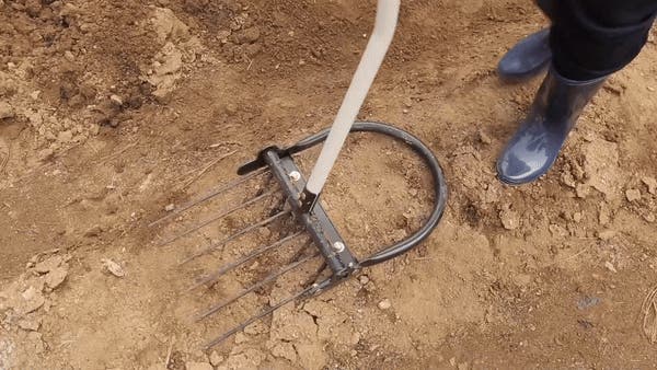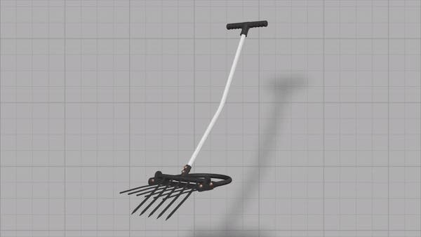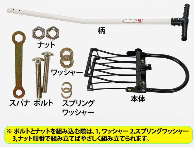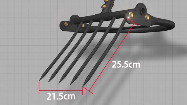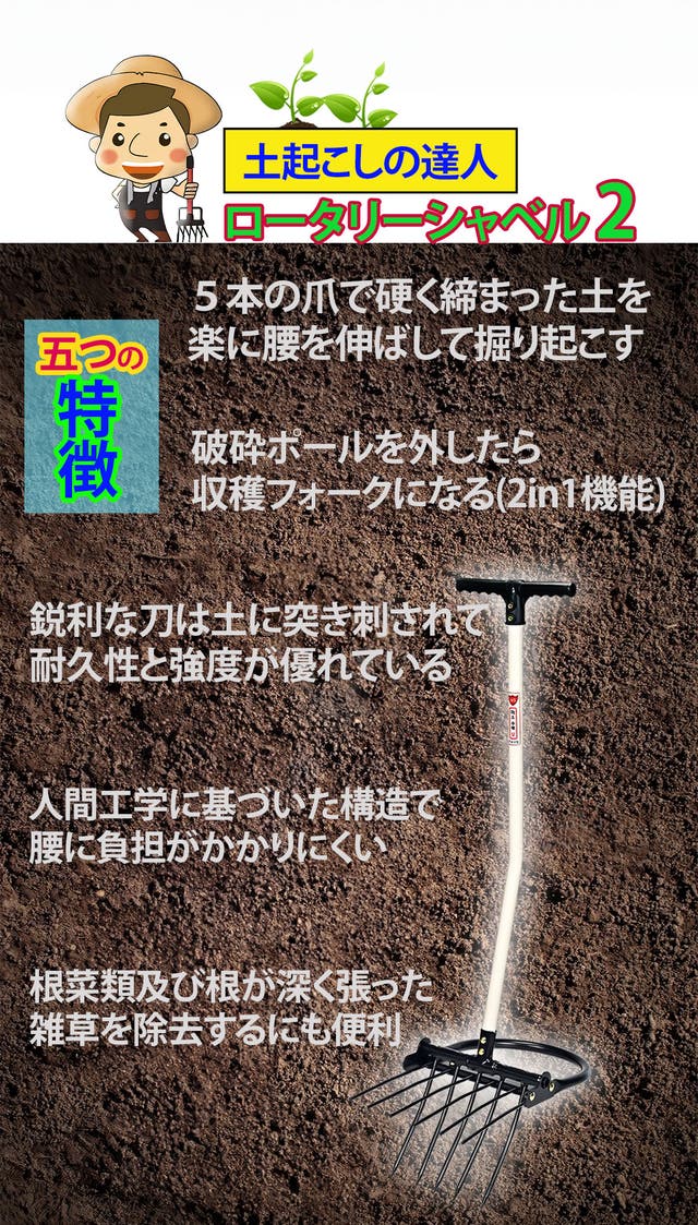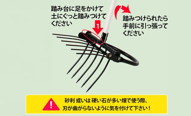 シャベルの役割をする五つの鋭い刃先と六つの破砕ポールが付いているので、土に突き刺した後、柄を手前に引っ張るとてこの原理で五つの刃が土を起こします。その際、破砕ポールは硬く締まった土を破砕してくれるのでシャベルと備中鍬で作業をするより作業の能率が上がります。