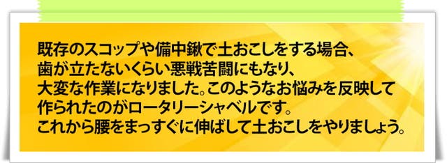 また、何よりも小規模の農家や菜園では機械を使うより、主にスコップで土を起こす場合が多いあると思います。その際、腰に負担がかかり、作業の能率が上がらないと言われています。それで、すこしでも役に立って頂くために考えたのがロータリーシャベルです。