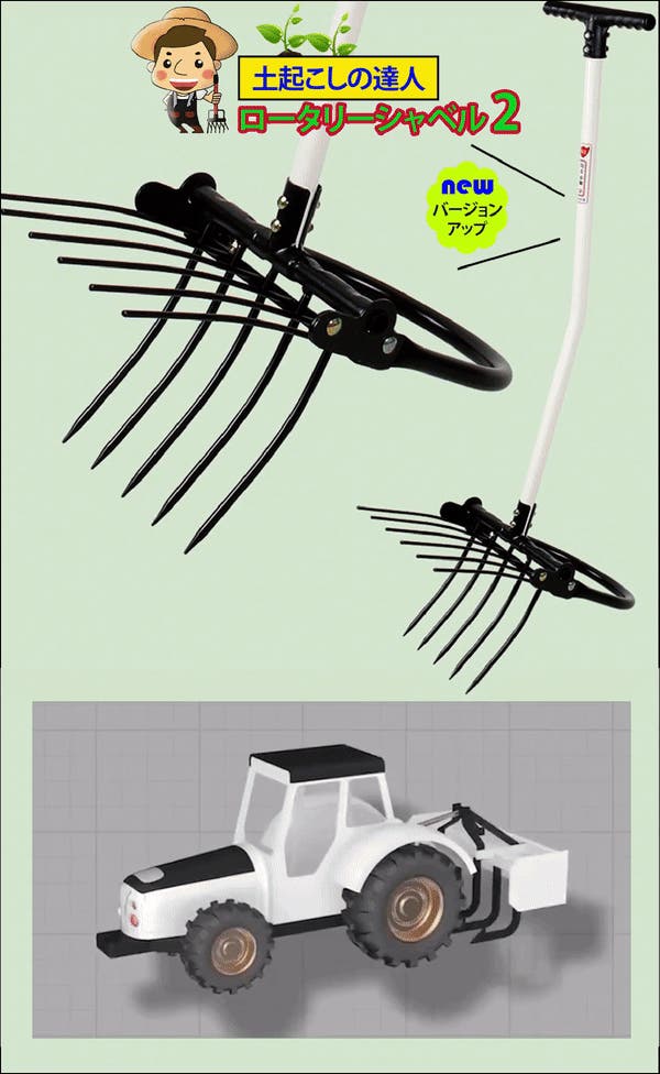 - ロータリーシャベルの第2弾。雑草、根菜類など根が深く張った土でも掘り起こせるので除去にも便利