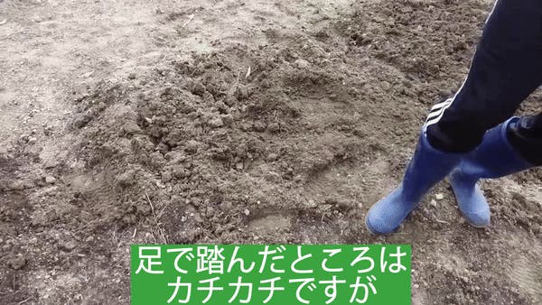 土の地面を足で踏んでみましたが他のイメージでも見た通り、その差が大きいです。土の状態が踏み固められた土ではスコップを使うより楽な姿勢で苦労せずに腰にも無理がないロータリーシャベルで使ってみるのはいかがですか?
