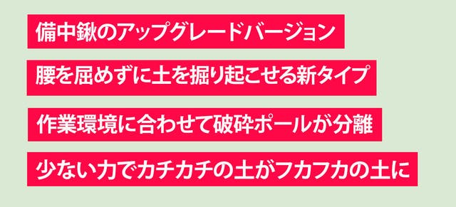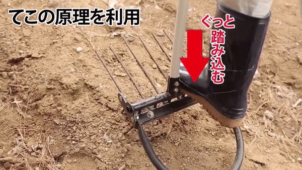 - てこの原理で硬く締まった土を楽に、賢く、腰をまっすぐ伸ばして腰の負担も軽減してくれる新タイプ