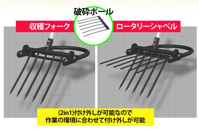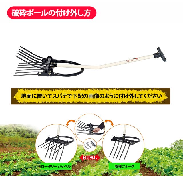 2, 破砕ポールが付け外し可能なので外したら収穫フォークにもなる(2in1機能)