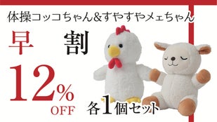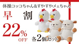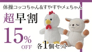 お一人でも多くの方にお得に「体操コッコちゃん」「すやすやメェちゃん」をご使用頂きたく、先着順ではございますが【超早割】もご用意させていただきました!もちろん、コッコちゃんとメェちゃんとがセットになったリターンもございます!割引率は最大で各2個セット25%OFF♪この機会に是非お求めください。