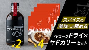 ヤドコーラドライ(300ml)2本に、ヤドカリー人気の国産黒毛和牛すじ肉のスパイスカレー4箱とスパイスごはんの素が入ったセットです。