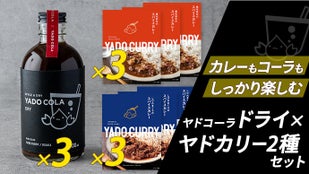 ヤドコーラドライ(300ml)3本に、ヤドカリー人気の国産黒毛和牛すじ肉のスパイスカレー3箱としびれまぐろのスパイスカレー3箱、スパイスごはんの素が入ったセットです。