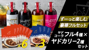 ヤドコーラドライ(300ml)/クラシカル(300ml)/ナチュラル(300ml)/ベリーピンク(300ml)各1本に、ヤドカリー人気の国産黒毛和牛すじ肉のスパイスカレー6箱としびれまぐろのスパイスカレー3箱、スパイスごはんの素が入ったセットです。ご家族やご友人でシェアいただいても、パーティーなどの集まりにも、もちろんお一人でゆっくり楽しんでもいただける、スペシャルなセットです。