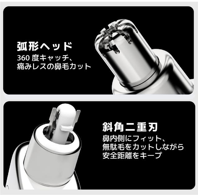 - 弧形のヘッドと斜角二重刃が、鼻腔にフィットし、痛みレス素早くカット。