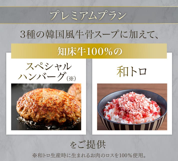 「肉のプロ」がこだわり抜いた、本格的な韓国風牛骨スープ3種を6セット、肉の甘みが絶品の知床牛100%和トロを2セット、さらに北海道産牛肉の旨味を凝縮したスペシャルハンバーグを2セット組み合わせた、究極の贅沢セット!