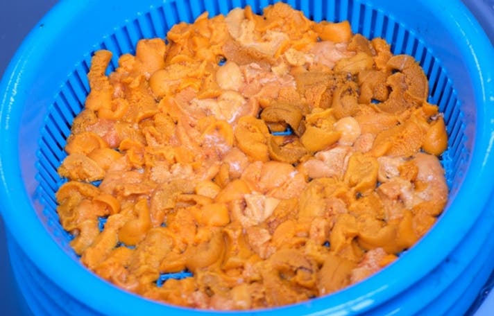 鮮度の良い水揚げされた雲丹をすぐに殻割りし、まずは電解水でしっかりと洗います。