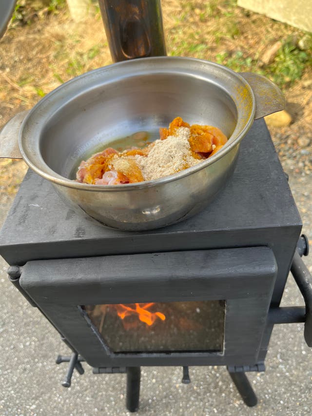 食材を事前に準備(上記は火を通りやすくするため野菜類は薄切りに下準備)した状態で調理時間は約30分。遠赤外線で素材の芯まで火が通りやすく、味も染み込み柔らかくなります。*炒める際、薪を足して火力を調整しています。