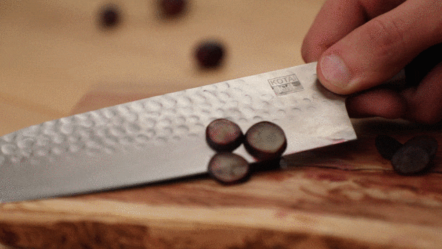 さらに『固体』の三徳包丁は「槌目(つちめ)加工」により、刃と切る食品との間に小さな隙間ができ、食べ物が刃にくっつくのを防ぎます。
