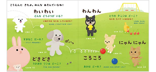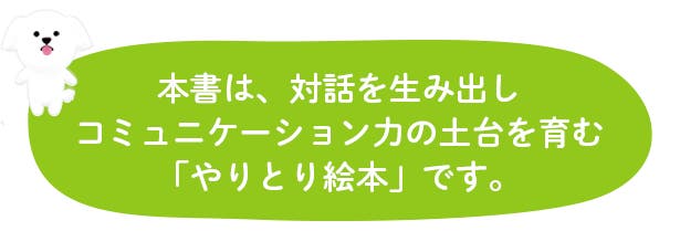 「やりとり絵本」では、問いかけによって物事を主体的に考え、自分なりの言葉にして発言する能力を育みます。子どもと対話のやりとりをすることで、コミュニケーション力の土台を育むことを目的としています。