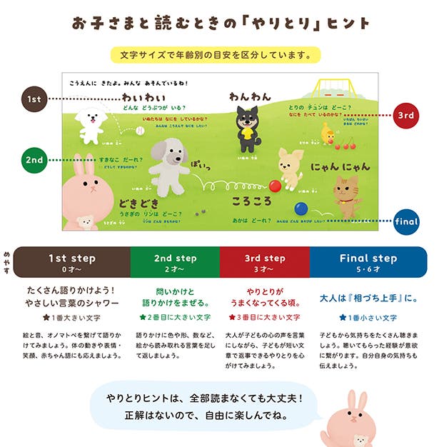 お子さまの年齢(0~6才)に合わせた問いかけで、対話がはずむ『やりとりヒント』 付の絵本です。楽しみながらコミュニケーション力の土台を育てます。