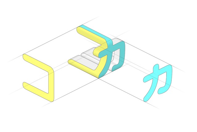 2つのコトバを3次元的に直角方向からぶつけることで、1つ1つの文字からは想像もできない、面白い形ができあがります。