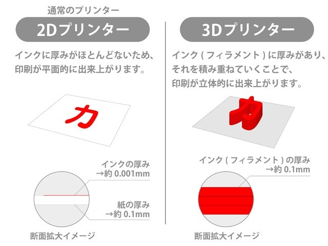 紙に印刷する通常のプリンターのインクに厚みがあると考えると分かりやすいかもしれません。