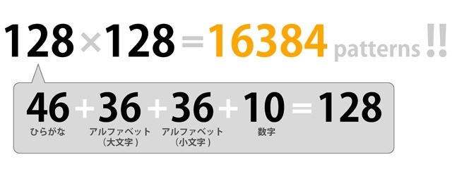 合計128文字を掛け合わせると、組み合わせは16384パターンになります!