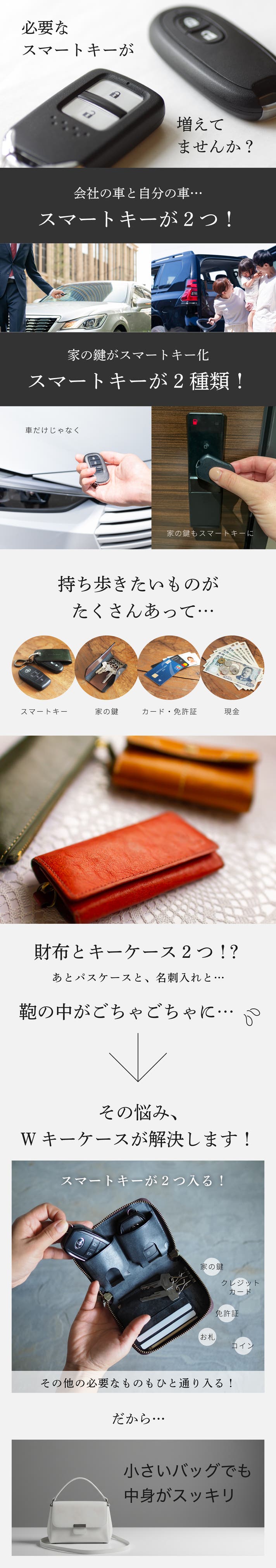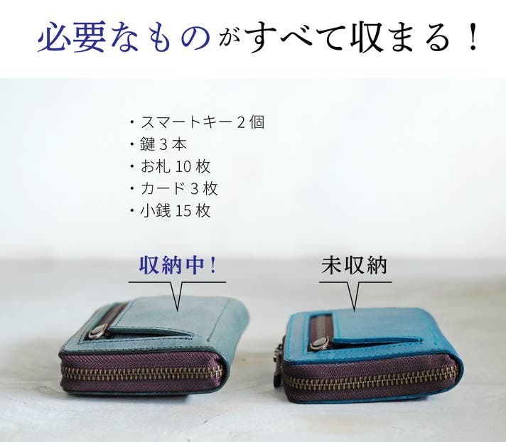 - 「車や住宅用のスマートキーが2つ入る」+「お金やカードも入る」=これひとつでお出かけOK!