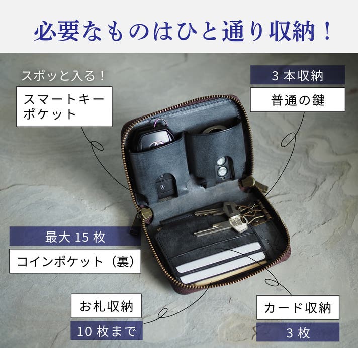 スマートキー2つに通常の鍵が3本入るほか、カードポケットの裏が札入れになっていて、カードは3枚、お札は10枚(重ねた状態で)まで収納できます。 キーケース外側のコインポケットには小銭が最大15枚(999円分)入ります。 財布の開口部はファスナーで囲われているので、中身が飛び出す心配もありません!