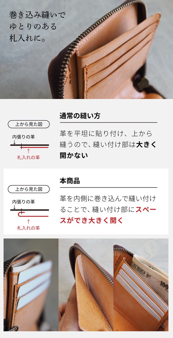 - 革を『巻き込んで縫う構造』だから、見た目以上にお札が入る!