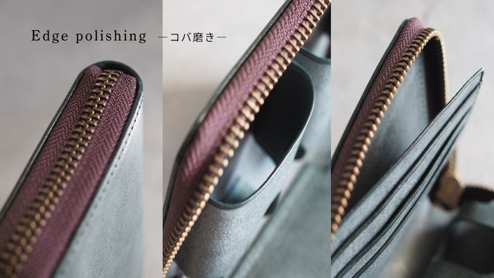 革の裁断面(コバ)は角を落として面取りし、ワックスを染み込ませてスリッカーという磨き専用の道具や帆布を使って手作業で磨いています。